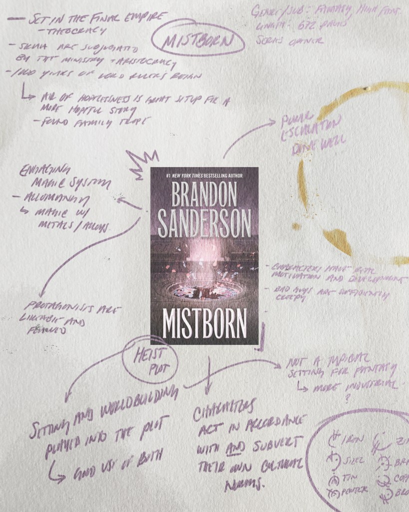 Last night, I finished my first book of 2022: Mistborn by Brandon Sanderson. Formerly known as Mistborn: The Final Empire, this book kicks off the Mistborn Trilogy– one of Sanderson’s most beloved adult fantasy series. The first half of this review will be spoiler free, and the rest will be all of my nitty-gritty thoughts on the events of the book. The two reviews will be the same, except the spoilers will be taken out of the non-spoiler one. If you’ve read the book, feel free to skip to the spoiler review.